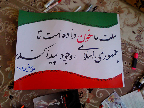یک پیشنهاد: به تعداد اعضای خانواده خودمان، مقوای رنگی بخریم. کم سواد هم که باشیم، می توانیم در قالب چند جمله ساده، حتی با دست خطی معمولی، غیرت دینی مان را به معرض نمایش بگذاریم. می توانیم به مسئولین و غیرمسئولین، داخلی ها و خارجی ها، بگوییم: ما خسته نشده ایم و مثل کوه پشت انقلابمان ایستاده ایم. همه مان. مادران، پدران، روستائیان، مربیان، دانش آموزان، دانشجویان، حوزویان، بسیجیان، اساتید، فرهنگیان، پیشه وران، مسئولان، مسئولان، مسئولان.... ![]() جملات امام خمینی (ره): * آمریکا هیچ غلطی نمی تواند بکند. * این اعجاز بزرگ قرن محتاج حفظ و نگهداری است. * انقلاب اصیل ما جلوه ای از نهضت پرعظمت حضرت رسول الله است. * امام حسین (ع) با خون خود اسلام را زنده کرد، شما هم به تبعیت از او، انقلاب و اسلام را ضمانت نمایید. * اگر تمام عالم هم به ضد ما قیام کنند و ما را هم نابود کنند، ما پیروزیم. * ما ترس نداریم برای اینکه ما حقیم. * ما حق هستیم و حق بر باطل پیروز است. * ما می خواهیم به همه دنیا نشان دهیم که قدرتهای فائقه را هم می توان به نیروی ایمان شکست داد.